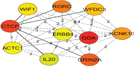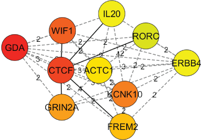 在自底向上法的放射分析中,CTCF、ERBB4和RORC分别从1到3排列。然后,FREM2和DGA排列为4。此外,GRIN2A、WIF1、WFDC3、ACTC1和IL20排列为6到10。CTCF与银屑病相关,因为它激活了B淋巴细胞的分化(图9)。