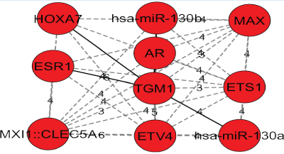 在自下而上方法的MNC分析中,hsa-miR130a、hsa-miR-130b、ETS1、MAX、ESR1、TGM1、ETV4、AR、HOXA7和MXI1::CLEC5A的排名为1(图3)。