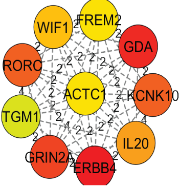 在采用自底向上法进行MCC分析的情况下,ERBB4、GDA和GRIN2A的排名分别为1至3。然后RORC、KCNK10排名第4位,IL20、WIF1、FREM2、ACTC1和TGM1分别排名第6至10位。ERBB4的信号传导参与银屑病的疾病病理学(图1)。