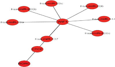 采用自底向上的WIF1聚类系数分析,CTCF、CUX1、hsa-miR-127-5p、hsa-miR129-5p、hsa-miR-137、hsa-miR-140-3p、hsa-miR-144、hsamiR-15a、hsa-miR-15b排在第1位。WIF1与银屑病有关,因为它下调病变中的WNT蛋白(图12)。