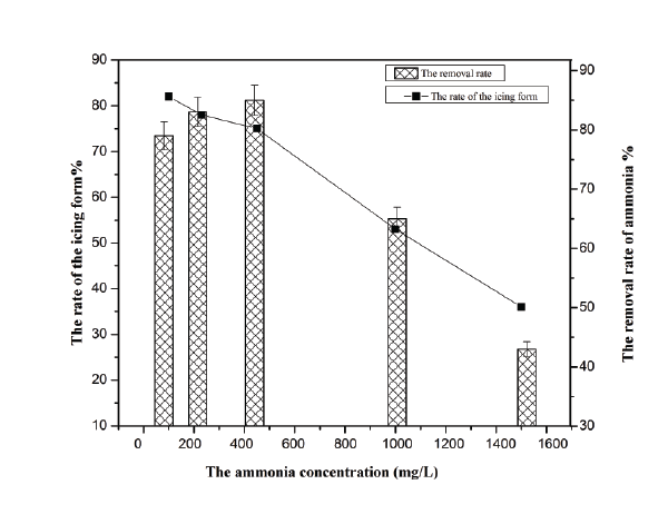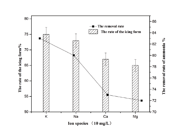 从图4可以看出,模拟实验中铵态氮的去除率和结冰的形成率依次为K+> Na+> Ca2+>毫克2+离子浓度为10mg /L。这可能与所研究离子的水合自由能大小有关,按Mg的顺序提供2+> Ca2+>Na+> K+.水中的离子以水合形式存在,可以描述为Mn+ (H2 O)n,有n个水分子与几何上定义的水合壳中的阳离子配位。水合自由能表明水合离子相对于未水合离子的稳定性。与水分子有强相互作用的离子在冻结过程中更容易加入冰相。因此,水合能越小的离子与水的结合越少,去除率越高[24]。