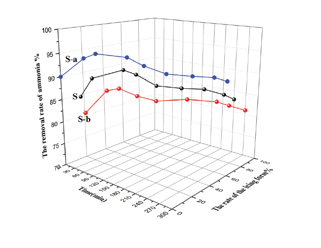 四种溶液(S-a、S、S-b和水溶液)中最终产物的铵浓度分析结果如图6所示。数据表明,当冷冻时间达到80分钟时,S-a溶液的最终铵浓度较低,为8 mg/L。不含任何添加剂的铵水溶液显示出较高的最终铵浓度,比直接排放标准高四倍此外,研究结果还表明,这四种溶液具有不同的氨氮去除速度,其顺序为:s-a>s>s-b>only water water solution。这可能是因为s、s-a和s-b具有增强氨氮去除过程的重要性质。
