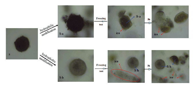 图7:S-a和S-b两种不同处理表面在冻结过程中形成的冰形态图。