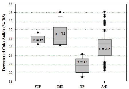混合A/B固体的预测脱水率为26.8±0.3%(平均±CI),低于VIP和BH设备的平均脱水率(分别为27.8±0.5%和29.4±1.0%)。NP设施最低,为23.5±1.4%。如果A级生产的固体颗粒比例接近A/B设备[6]中典型的75%,那么预测的饼状固体含量将略高,约为28%。PS与SS的实际比例较低,为70±15%,这是由于a级中试对COD和TSS的去除效率较低,因为b级中试对COD的去除进行了控制,以优化b级中试的脱氮效果。BH设施的饼状固体含量最高,这是因为化学强化一级处理工艺的固相去除率较高,加上铁盐会产生金属沉淀。NP的脱水能力很差,可能是因为该设备进行生物除磷,这已被证明会降低消化固体[25]的脱水能力。