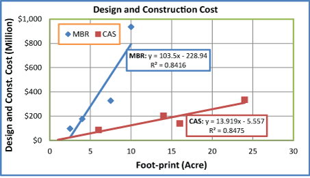 如图2所示,在大约11 MGD的工厂容量下,MBR和CAS的设计和建造成本是相同的。在11 MGD能力之外,MBR似乎很昂贵,而在11 mdd能力以下,CAS似乎很昂贵。这可能是因为MBR技术相对较新,需要仔细的设计和膜的选择,与CAS技术所需的材料相比,初始投资更高。虽然就设计和建造成本而言,CAS似乎是更高容量的处理厂的最佳选择,但它并没有真正给出任何根据设计和建造成本选择MBR或CAS的迹象。主要考虑的应该是基于设计期间的总成本的长期性能和成本效益。