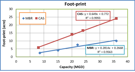 图5显示了用地占用与工厂容量之间的关系。如图所示,MBR和CAS的足迹要求没有相同的公共能力。CAS的足迹总是高于MBR。这是由于MBR工艺不需要二次澄清剂[20],从而减少了对土地面积的要求。CAS的单位足迹增加速率约为0.649英亩/MGD容量,而MBR的单位足迹增加速率为0.281英亩/MDG。因此,在脚印要求方面,MBR是一个明确的选择选择。然而,基于前面提出的相同论点,主要考虑的应该是基于设计期间的总成本的长期成本效益,而不仅仅是脚印要求。这里需要强调的支持MBR的论点是,对于地价昂贵的地区,MBR将是一个更好的选择。