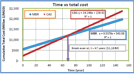 累计总成本计算为设计和施工成本加运维成本/单位产能/年乘以年数。最初的设计和建造费用是按每单位能力的加权平均成本计算的。图6显示了时间与累计总成本的对比。如图所示,盈亏平衡年份为67年,金额为11.83亿美元。虽然MBR系统的基本建设成本/营运成本(5.4398亿元)高于CAS系统的基本建设成本/营运成本(2.2892亿元),但在67年后,MBR系统将更具成本效益。因此,对于任何工厂的能力,MBR系统是长期运行和成本效益的最佳选择。