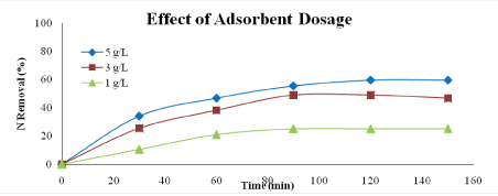 图11:吸附剂用量对脱氮效果的影响(吸附剂类型:热处理吸附剂,转速:125 rpm,吸附剂粒径:63µm,接触时间:150 min)