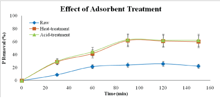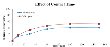图12:接触时间对营养物去除的影响(吸附剂类型:热处理吸附剂,吸附剂用量:5 g/L,吸附剂大小:63µm,接触时间:150 min,速度:125 rpm)