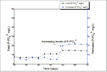 在1圣硝酸盐(NO3.-N)的浓度范围分别为34.9±0.06 mg/L ~ 10.8±0.02 mg/L和23.2±0.16 mg/L ~ 7.0±0.34 mg/L。氨氮(NH4.-N) 饲料和渗透液中的NO含量分别为13.7±0.03 mg/L至4.0±0.05 mg/L和5.7±0.05 mg/L至2.0±0.02 mg/L3.-N在可接受的范围内5 ~ 30 mg/L,根据世界卫生组织指导方针废水再利用灌溉[16]。德赢vwin首页网址但在第60天,NO增加3.- n。这主要发生在水被替换的时期。NO的增加3.-N在渗透过程中去除率低,且在饲料中添加量增加。提出了在MBR处理系统中引入反硝化池的必要性,作为促进NO去除的一种纠正措施3.-N通过反硝化过程。过量NO3.-N对鱼没有直接影响;然而,它支持池塘中水生杂草的生长,导致溶解氧的极端波动,从而导致鱼类死亡。