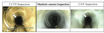 人孔摄像机与CCTV的匹配率(不包括“垂直方向变形”和“附着沉积物、油脂”,本节不适用)分别为11%和68%。在这些结果中,人孔摄像机的关键缺陷率(第1-5项)为8%,无人机为74%,维修相关缺陷(第6-9项)为22%,无人机为44%。