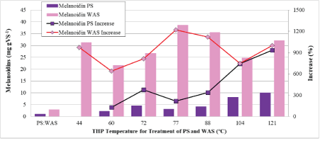 图4显示了THP过程中形成的黑色素的数量。低分子量碳水化合物和低分子量蛋白质在美拉德反应中生成黑色素,其数量不是直接测量的,而是计算出来的。对于PS,黑素素从1.2毫克gVS增加-1至2-9毫克gVS-1因为只有少量的低分子量蛋白质和碳水化合物存在。对于WAS,黑色素素从3毫克gVS增加-1至19-35毫克gVS-1由于大量的流明瓦碳水化合物和蛋白质反应(表2)。图4还显示类黑色素形成在THP PS相当比例的增加温度,然而,似乎是,没有关系THP温度形成率即使在高低温。黑素是一种棕色化合物,被认为难以被生物降解,因此在AD期间不会促进甲烷的产生。表2显示了形成的黑色素与未形成黑色素的碳水化合物和蛋白质总量的比例。这一比例介于12 - 67%之间,平均为39%,这意味着大量水解碳水化合物和蛋白质被黑色素“损失”了。