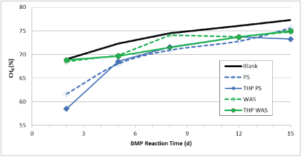 图7:低温/中温thp处理PS和WAS的BMP试验中沼气甲烷含量