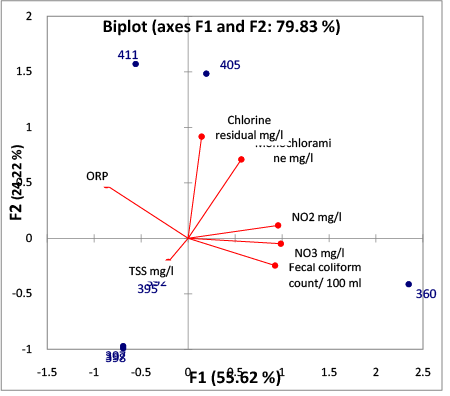 图4,变量的过程表示变化的方向,其长度等于这个方向的变化率。硝酸盐、亚硝酸盐和粪便数量的变化方向和速率相同;同样,氯残留和一氯胺遵循同样的模式。接近于零的变量与主成分关系较差,可以消除而不影响结果,例如TSS。相反,ORP和粪便计数的变化方向相反,变化速率相同。