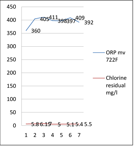 在400 mv下的氧化还原电位值影响粪便计数、硝酸盐和亚硝酸盐。氧化还原电位在400 - 500 mv之间,导致无机一氯胺成为优势种,根据Vectorin等人的[8],它是最强的消毒剂。当氧化还原电位小于400 mv时,如表1和表2所示,即使氯残留超过0.8 mg/l,仍有撞击现象。