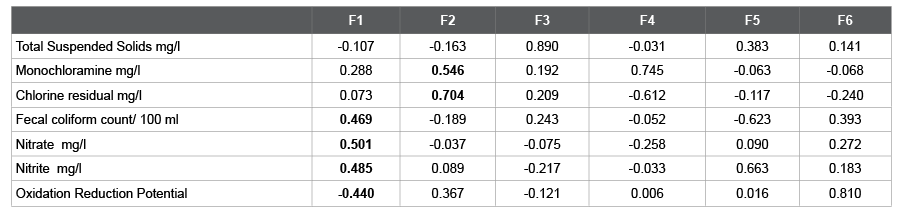 数据的特征值由Scree图2和表3给出,其中显示F1和F2说明了80%的变异模式。粪便计数/100毫升,硝酸盐和亚硝酸盐是F1因子的最高贡献者。另一方面,对于因子F2,一氯胺和氯残留是主要贡献者(加粗显示)。特征值给出了相应特征向量所占方差的程度(表4)[7]。