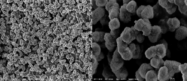 图2为该材料的SEM图像原位MnO的2.可以观察到,原位MnO的2粒子在本质上无定形的,具有大约120纳米的最大直径。用30分钟的老化时间,则原位MnO的2被观察到凝结成簇。随着原位MnO浓度的增加,MnO的聚集有增加的趋势2.