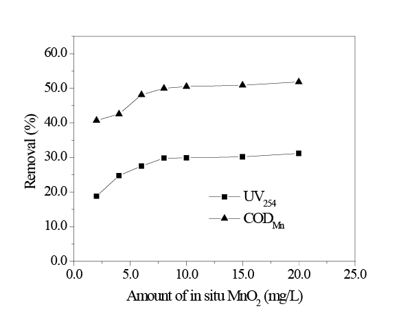 图4:量的影响原位MnO的2吸附(初始UV254.= 0.52;最初的鳕鱼锰= 13.02 mg / L;温度298 k;pH = 8.0;吸附时间2小时)。