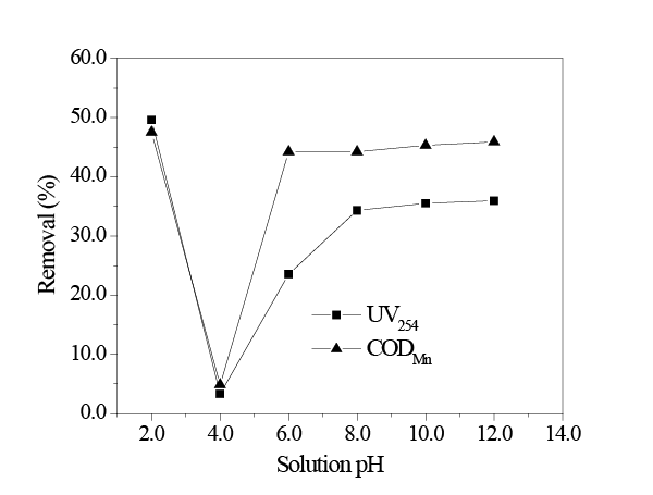 如图5所示,当pH值= 2.0,HA去除由UV254.和鳕鱼锰方法分别为49.59%和47.52%,高于碱性条件。当pH = 4.0时,HA去除率迅速下降。然而,用紫外线去除HA254.和鳕鱼锰当pH值为6.0及以上时,检测方法增加。
