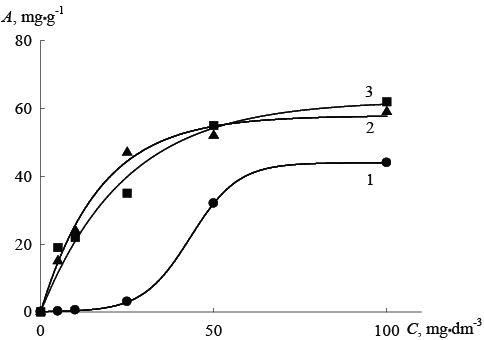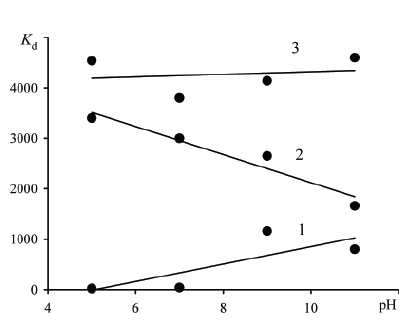 图1:溶液酸度的影响(500 mg•DM-3)的吸附容量(A马克斯(1)和含水合锡氧化物Dowex SBR-P/SnO的杂化离子交换剂2(2)和锡和氧化铁Dowex SBR-P / Sno2/铁2O.3.(3).